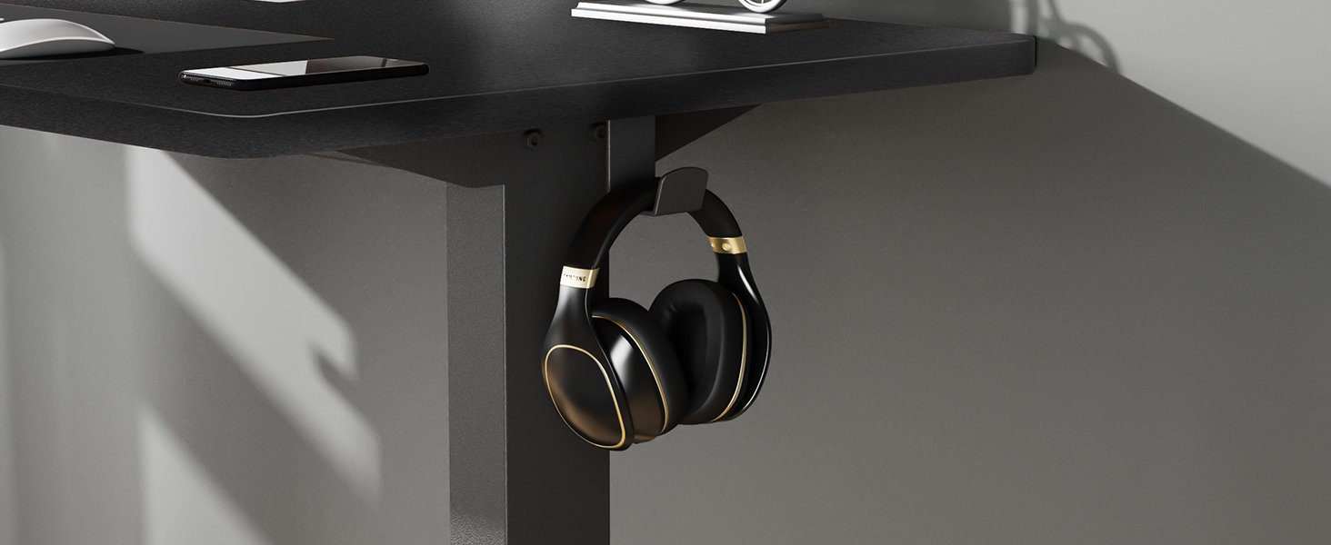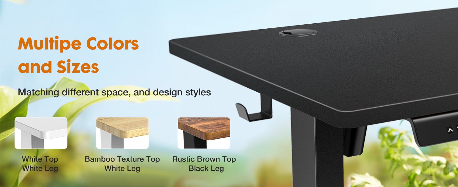 The electric standing desk boasts a waterproof and wear-resistant splice tabletop, ideal for maintaining a clean and organized workspace. It comes with a wire collector and two hooks, allowing you to keep cords and supplies neatly tucked away. This thoughtful design ensures your work area is both functional and aesthetically pleasing.