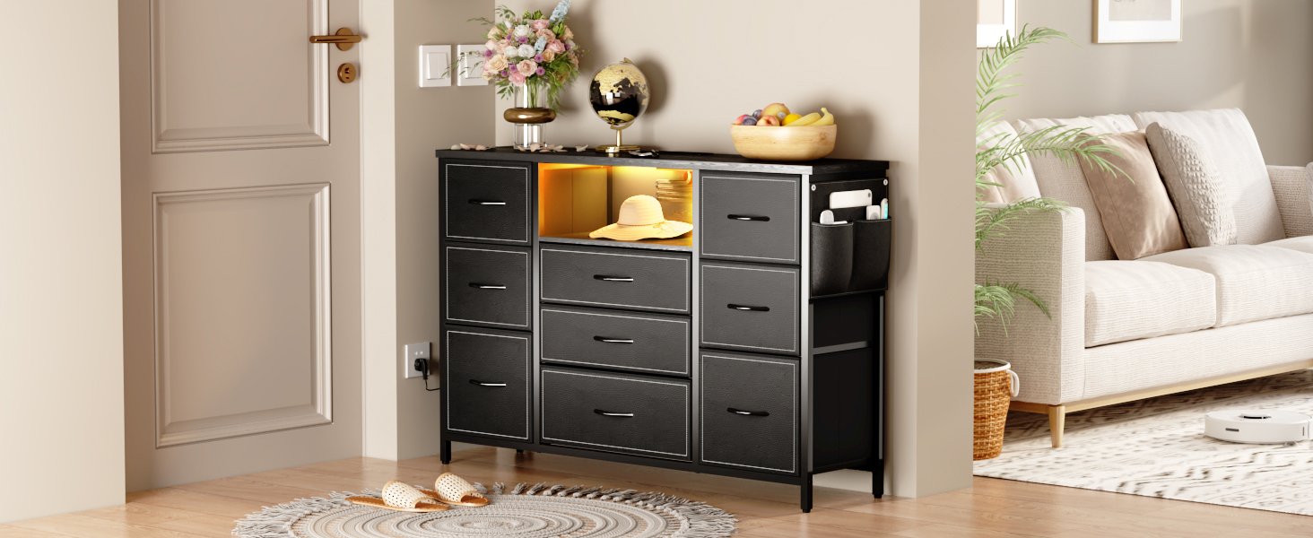 Sturdy and Durable Construction: Crafted from high-quality MDF and reinforced iron, this black dresser is both strong and lightweight, making it easy to move. Equipped with adjustable feet, it ensures stability on uneven surfaces while protecting your floor from scratches.
