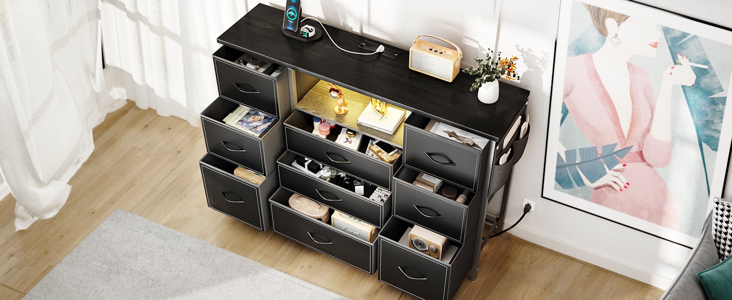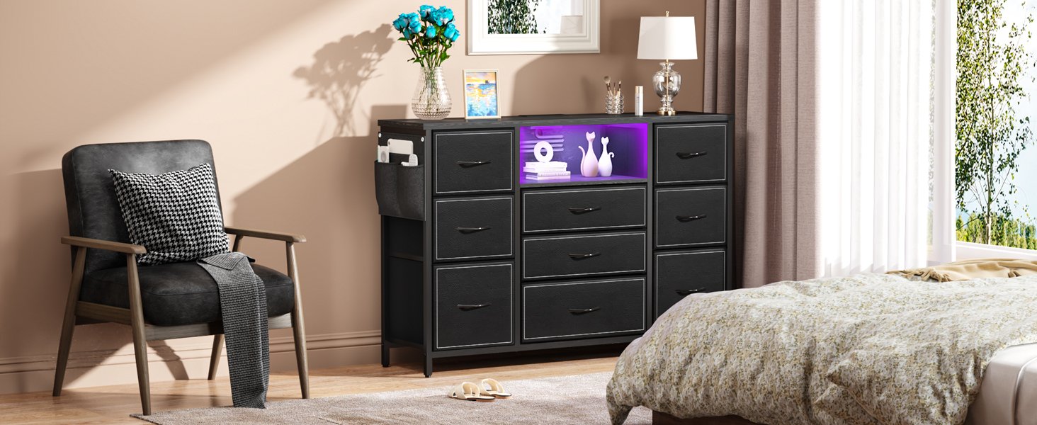 Ambient LED Lighting: Elevate the ambiance with our LED lights. Easily controlled via a remote or mobile app, the LED lights add a touch of elegance and style to your bedroom. The dresser also includes a charging station, keeping your phone, lamp, and other devices charged and ready to use.