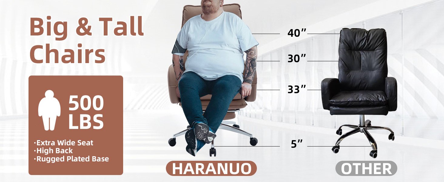 Discover the HARANUO big tall office chair, designed for unparalleled comfort. It combines the luxurious feel of a sofa with the ergonomic support of a sensible office chair. Key features include built-in lumbar support, a padded headrest, and armrests that gently wrap around your body, ensuring your spine remains in a neutral position. The chair, capable of supporting up to 500 pounds, is your perfect work companion.