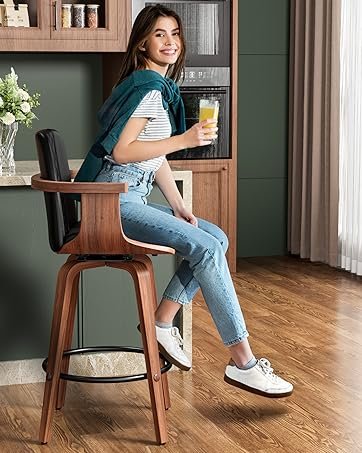 Elevated Design for Kitchen and Home Bar Our bar stools feature a 26" seat height and a high-back design, perfect for elevating your kitchen islands, home bars, or cafés. The walnut-veneered bentwood frame and easy-to-clean PU leather provide a stylish and practical solution.