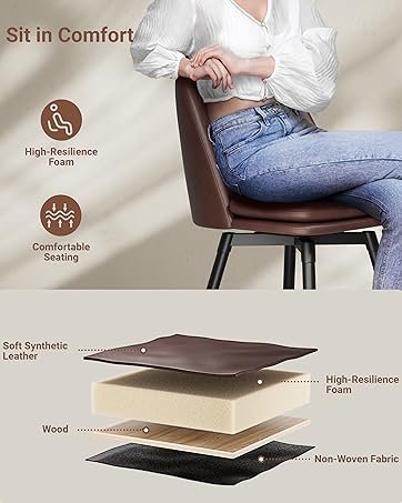 All-Day Comfort Our barstools are designed for your comfort. Thick 3" foam cushions (20% denser than standard) and ergonomic backrests with a 15° tilt reduce fatigue. The armrests are scientifically angled at 7° for natural elbow positioning, ideal for extended gatherings.